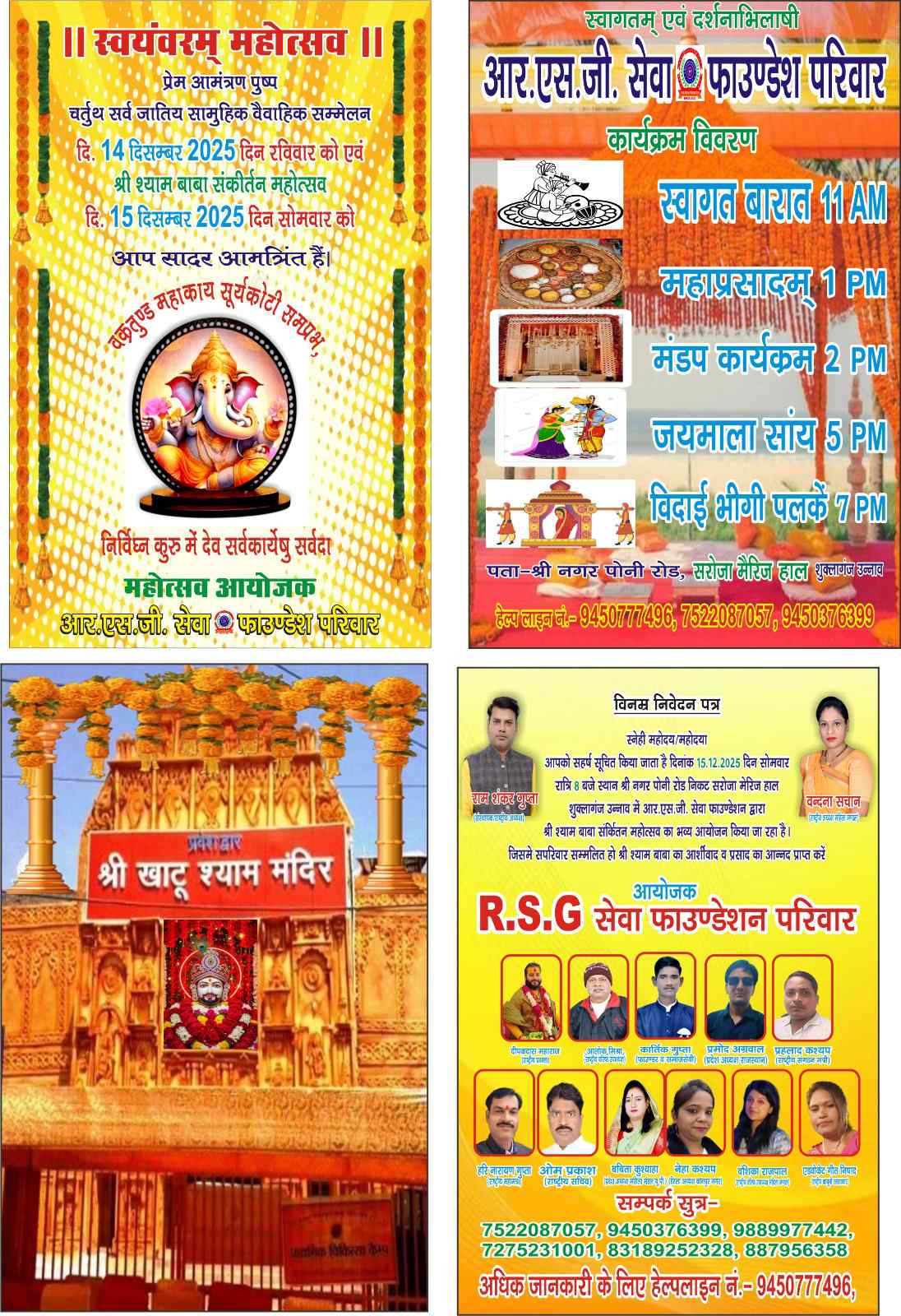 ★ वैवाहिक कार्यक्रम - RSG SEWA FOUNDATION द्वारा समय-समय पर रजिस्टेशन कर सर्वजातिय वर-वधु परिचय सम्मलेन व निशुल्क दहेज़ रहित गरीब कन्याओ के वैवाहिक कार्यक्रम आयोजित किये जाते है|