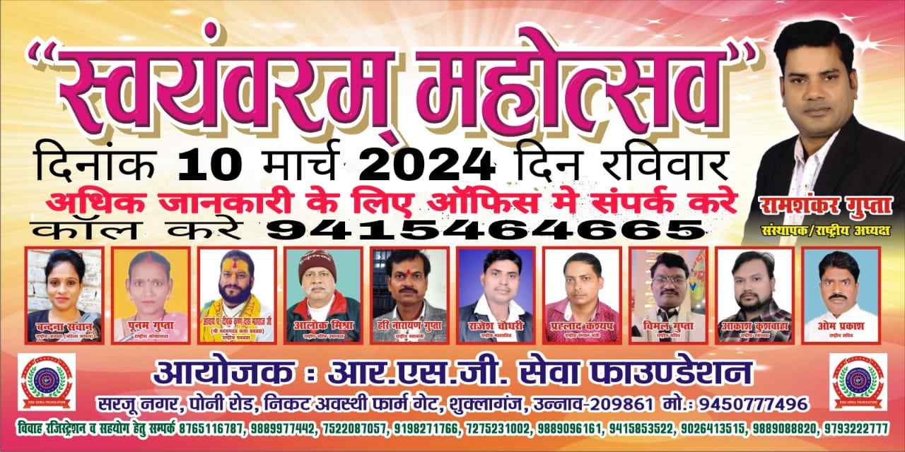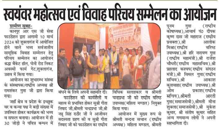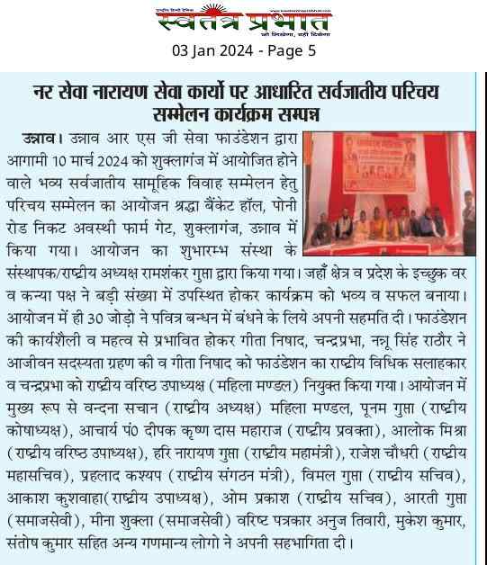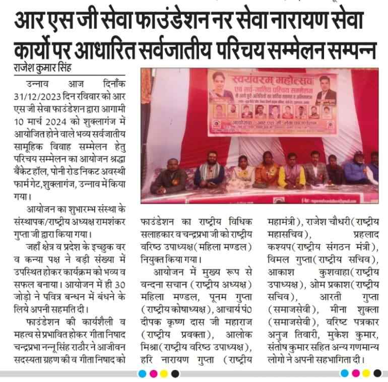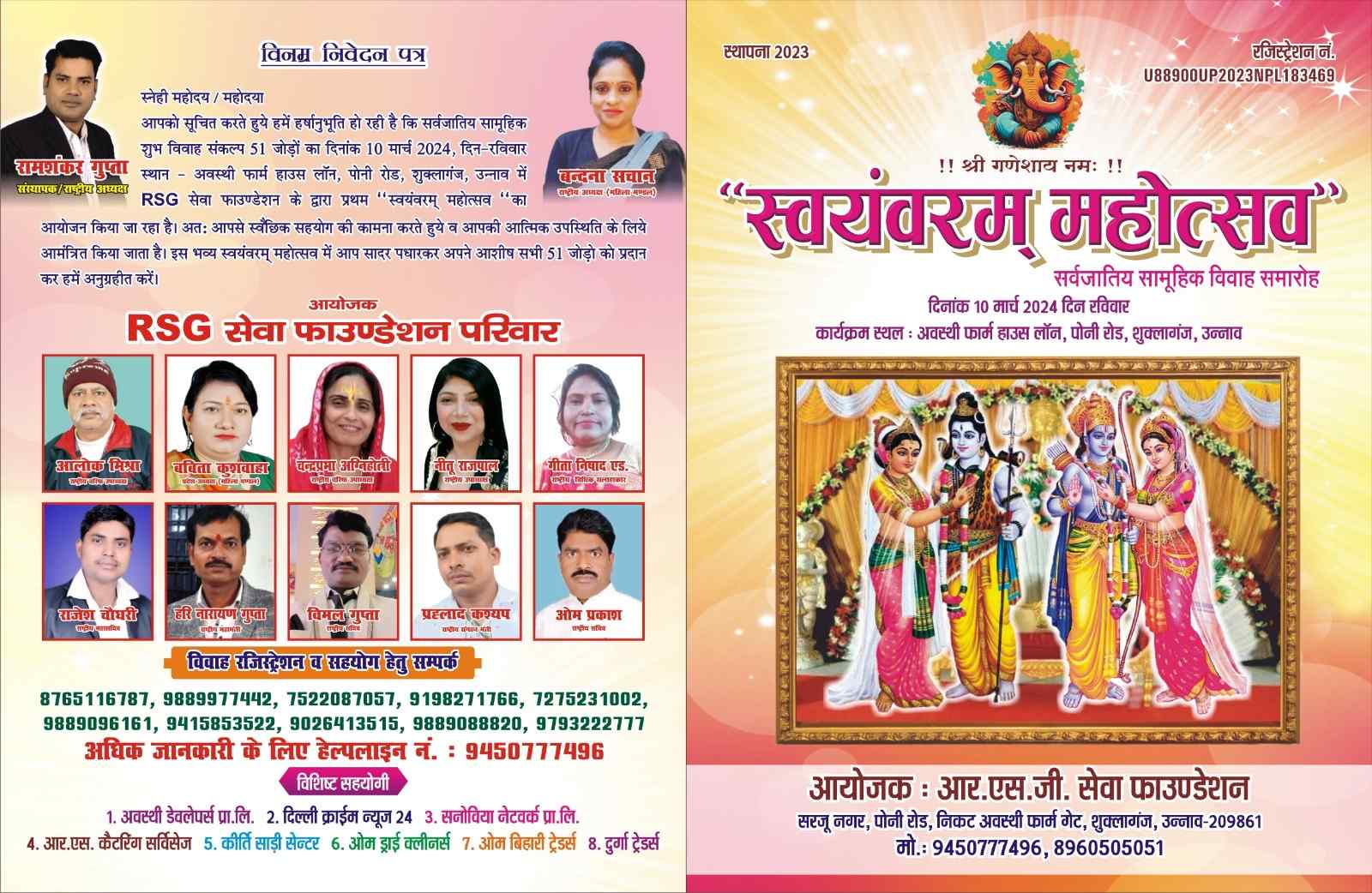 ★ वैवाहिक कार्यक्रम - RSG SEWA FOUNDATION द्वारा समय-समय पर रजिस्टेशन कर सर्वजातिय वर-वधु परिचय सम्मलेन व निशुल्क दहेज़ रहित गरीब कन्याओ के वैवाहिक कार्यक्रम आयोजित किये जाते है|